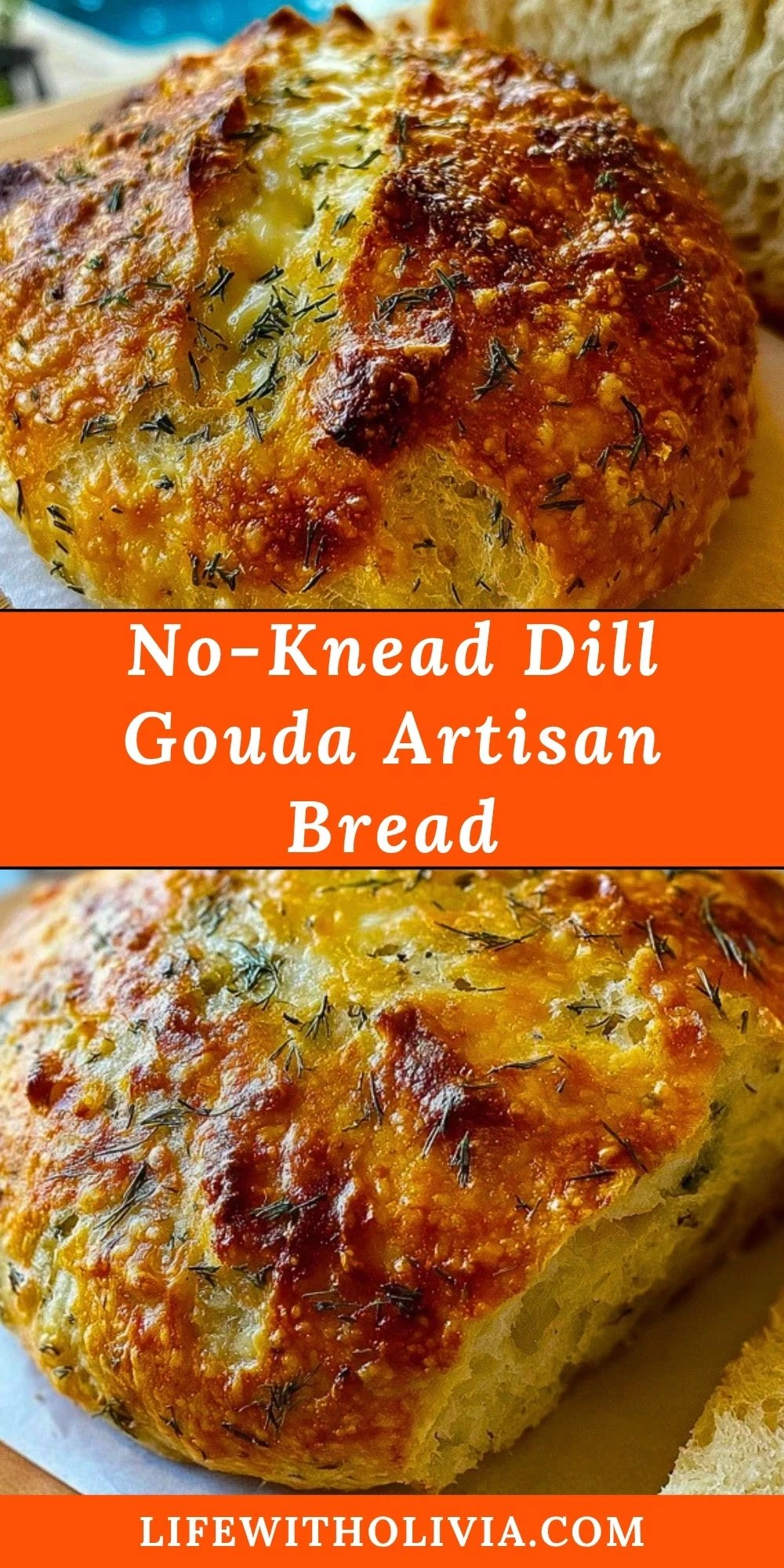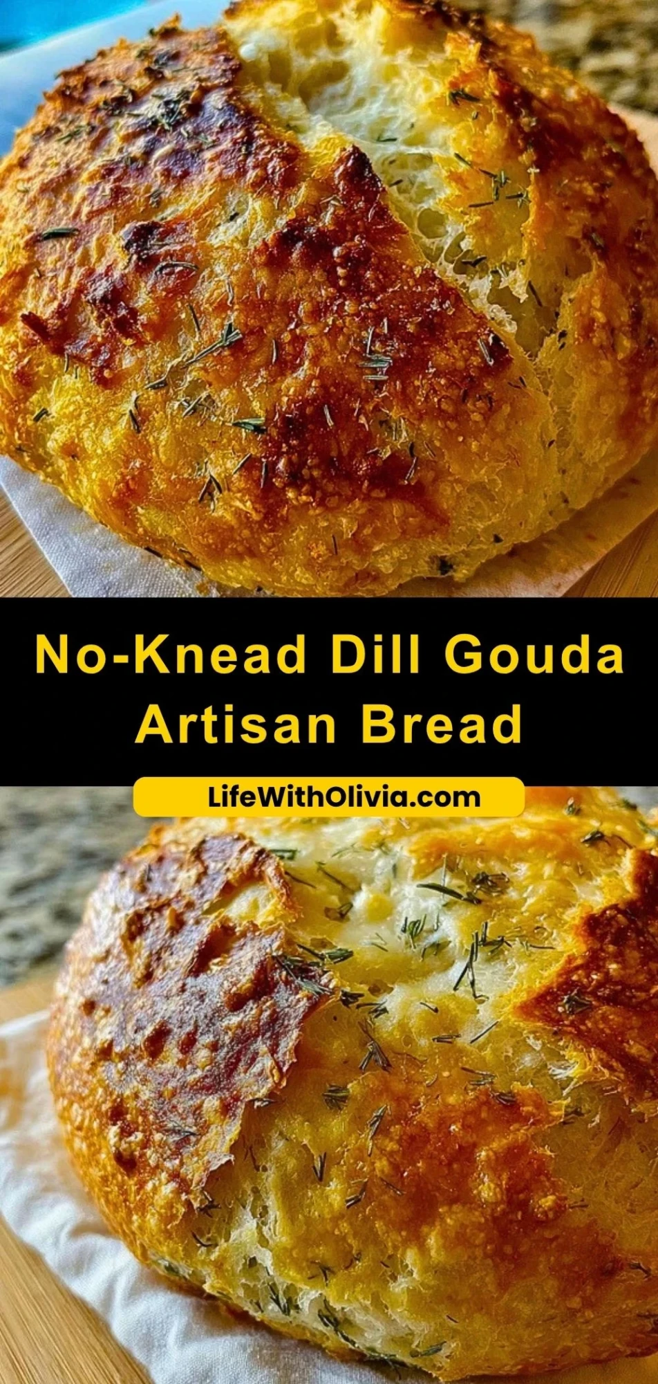 Keywords: no-knead bread, dill gouda bread, artisan bread, homemade bread, easy bread recipe, savory bread, quick breakfast, easy dinner, food ideas
