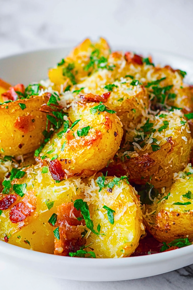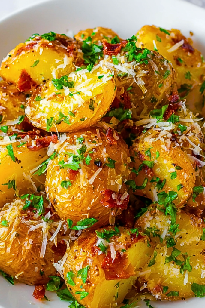 Transfer the potatoes to a serving dish and sprinkle with chopped fresh parsley. For an extra savory finish, top with crumbled bacon if desired.