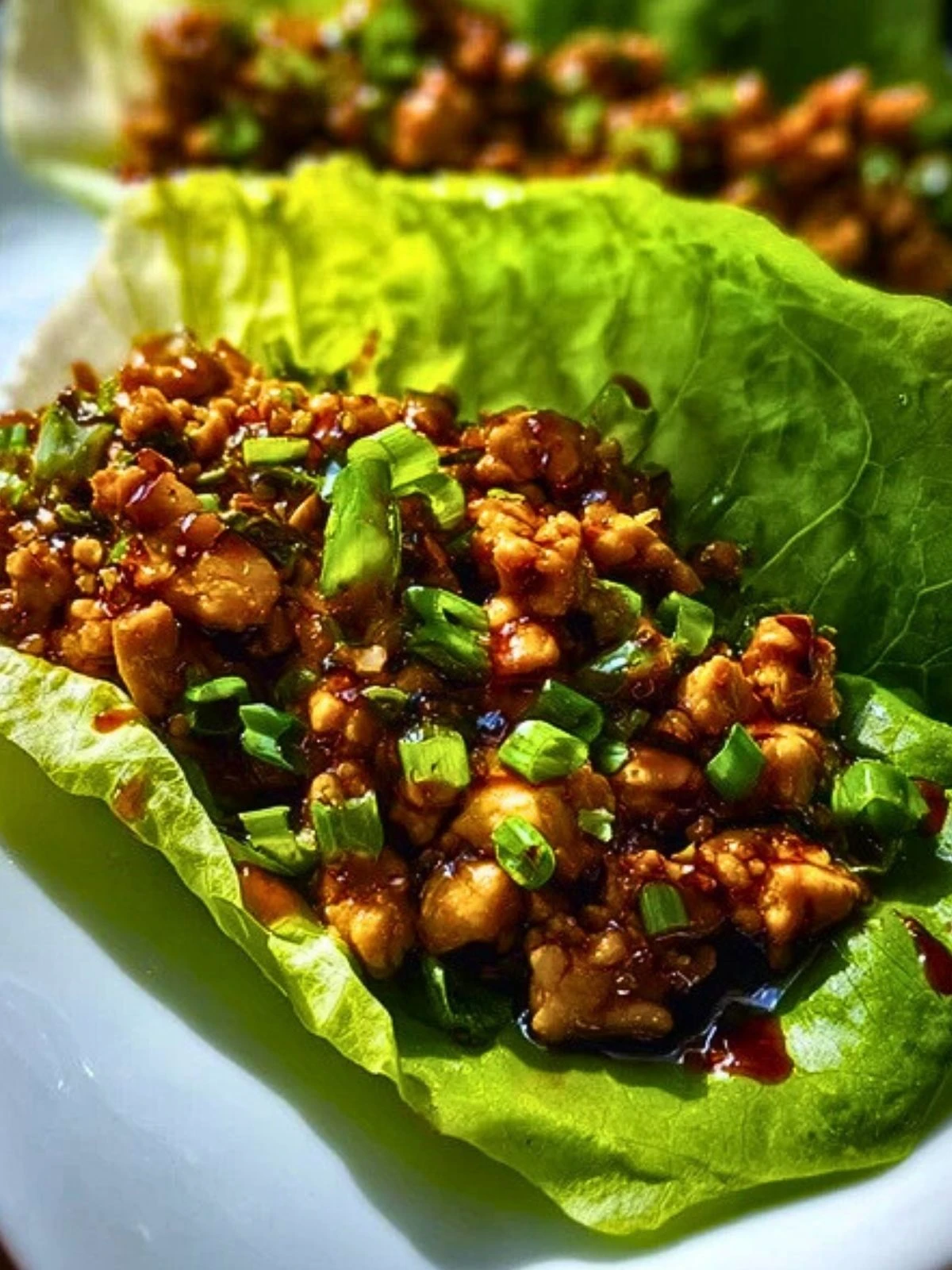 Juicy ground chicken is sautéed with garlic, ginger, and green onions, then tossed in a sweet-savory sauce with hints of hoisin, soy, and sesame. Served in crisp lettuce cups and garnished with crunchy water chestnuts and fresh scallions, every bite delivers crunch and umami with a hint of heat.