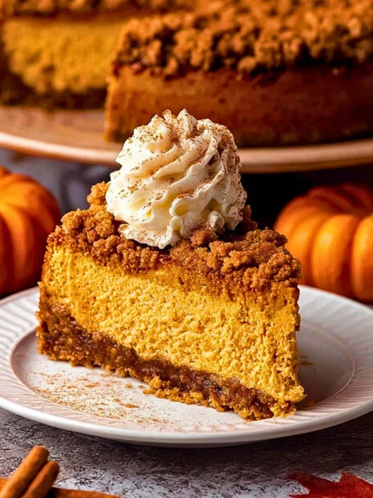 What makes this dessert truly unforgettable is the contrast of flavors and layers. You get the crisp streusel crunch, silky pumpkin cheesecake filling, and a chewy spiced crust that brings it all together. Add a swirl of whipped cream and a dusting of cinnamon on top, and you’ve got a slice that’s made for both taste and presentation.