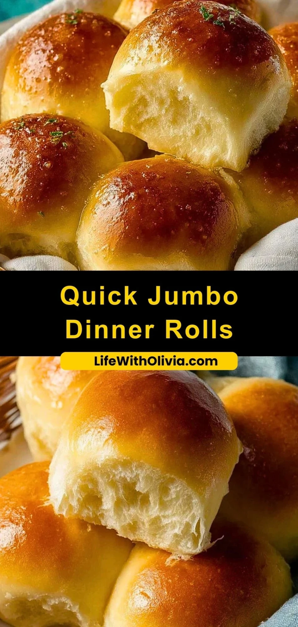 Soft, golden, and impossibly fluffy—these Quick Jumbo Dinner Rolls are your new go-to for everything from weeknight dinners to holiday feasts. Ready in a fraction of the time traditional rolls take, they’re a miracle of modern baking that doesn’t skimp on texture or flavor. Imagine warm, pillowy bread with just the right touch of sweetness, pulling apart effortlessly as steam escapes—pure comfort in every bite.