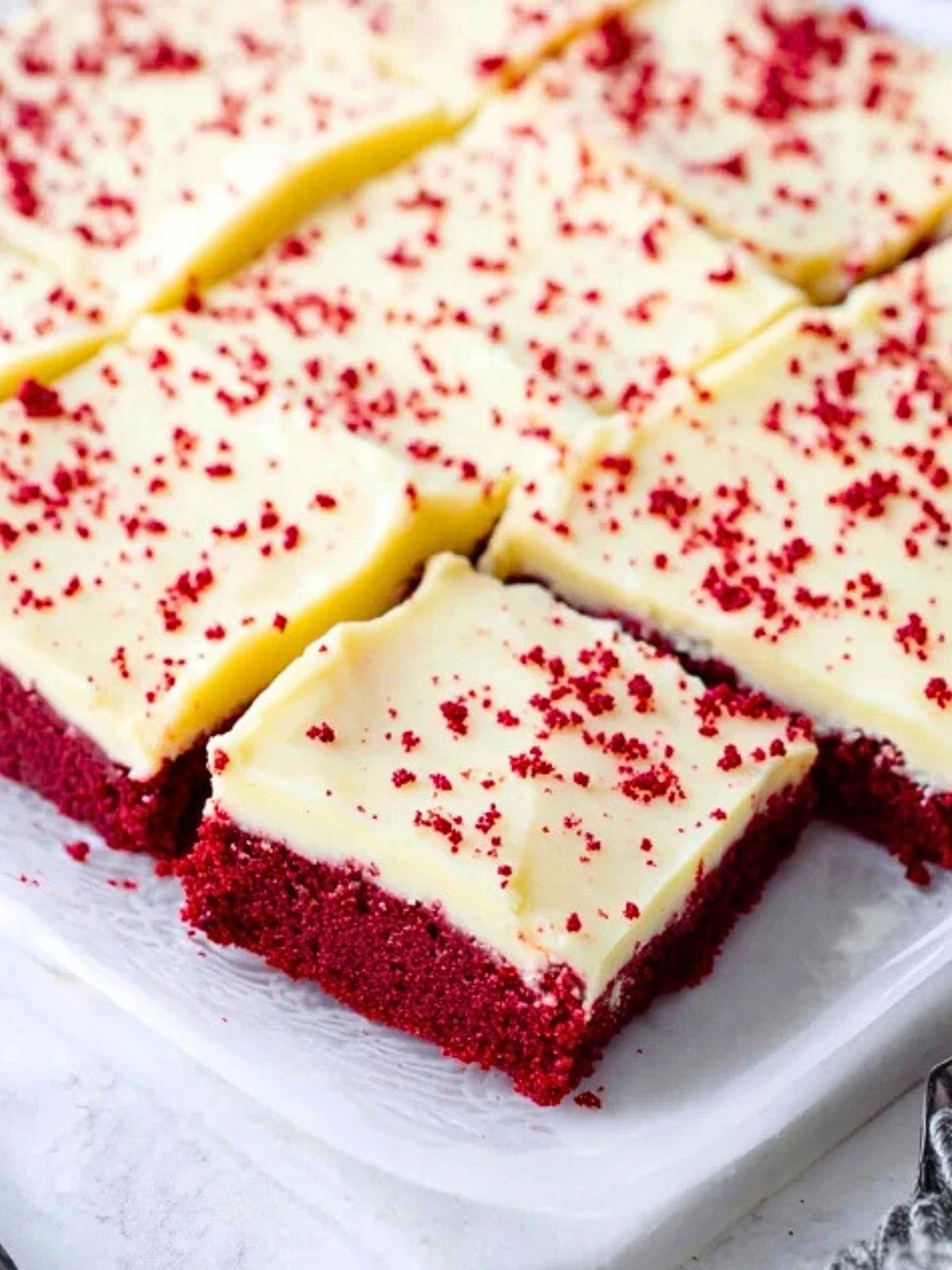 Once the bars are cool, spread the cream cheese frosting evenly over the top. If you saved some red velvet crumbs, sprinkle them over the frosting for that classic bakery finish.