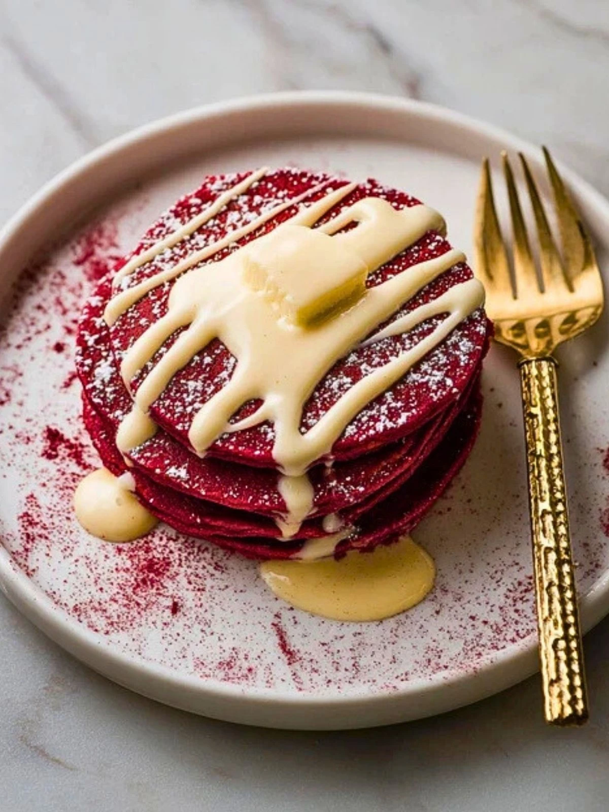 Start your morning with a luxurious twist on a classic breakfast favorite. These Red Velvet Pancakes are rich, fluffy, and have that signature cocoa-kissed red hue that makes them irresistible. Topped with a drizzle of cream cheese glaze and a pat of melting butter, they feel like dessert for breakfast—but who says you can’t indulge a little first thing in the day?