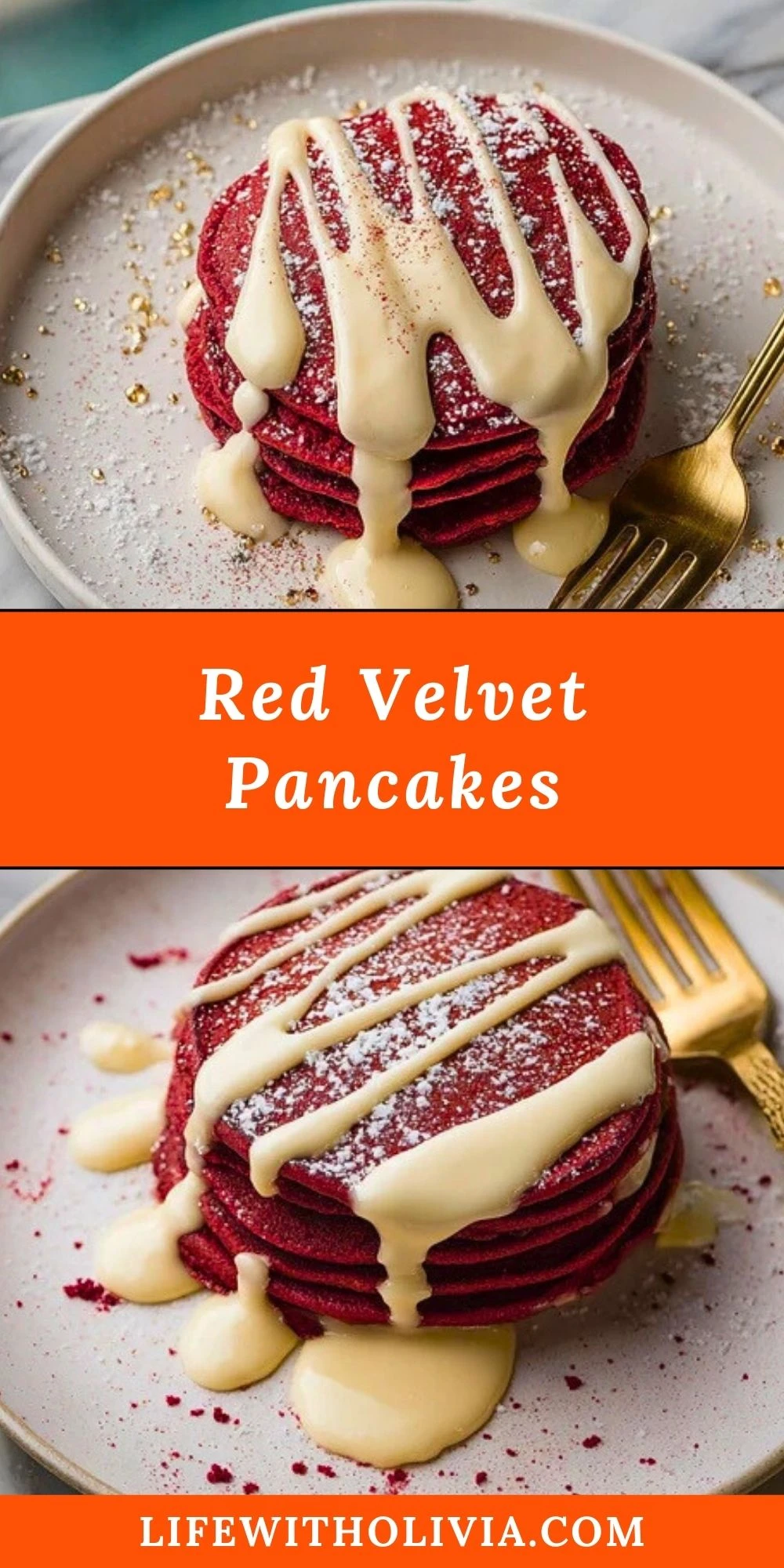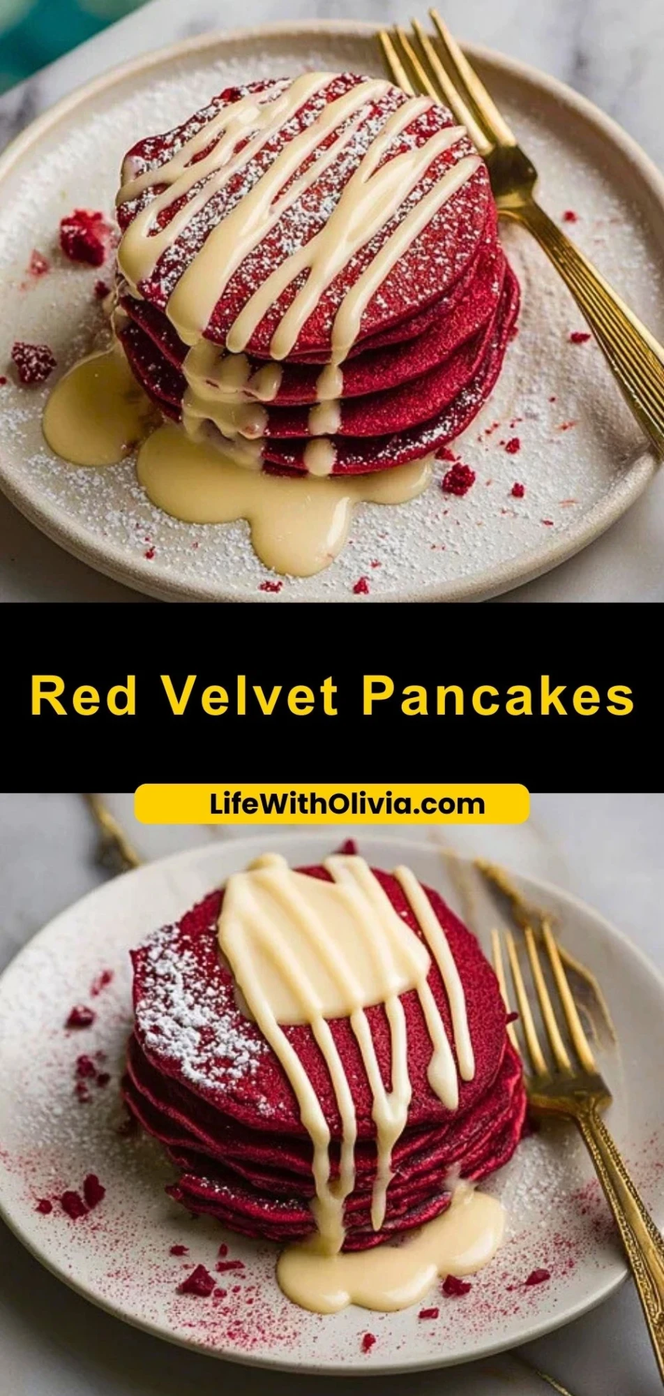 These Red Velvet Pancakes are best enjoyed fresh off the griddle, still warm and fluffy. Serve them stacked high with a generous drizzle of cream cheese glaze, a pat of butter, and a light dusting of powdered sugar. For a more decadent brunch, pair with fresh berries and a latte or mimosa.