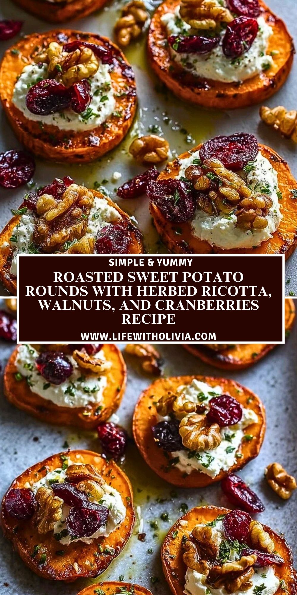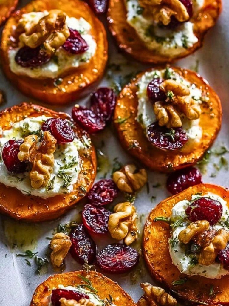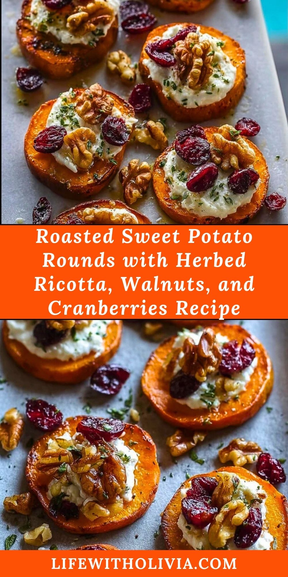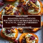 Looking for a savory-sweet appetizer or elegant side dish that captures the cozy warmth of fall? These Roasted Sweet Potato Rounds with Herbed Ricotta, Walnuts, and Cranberries are a festive showstopper. The balance of creamy ricotta, tangy cranberries, and toasted walnuts over caramelized sweet potato slices is truly irresistible.