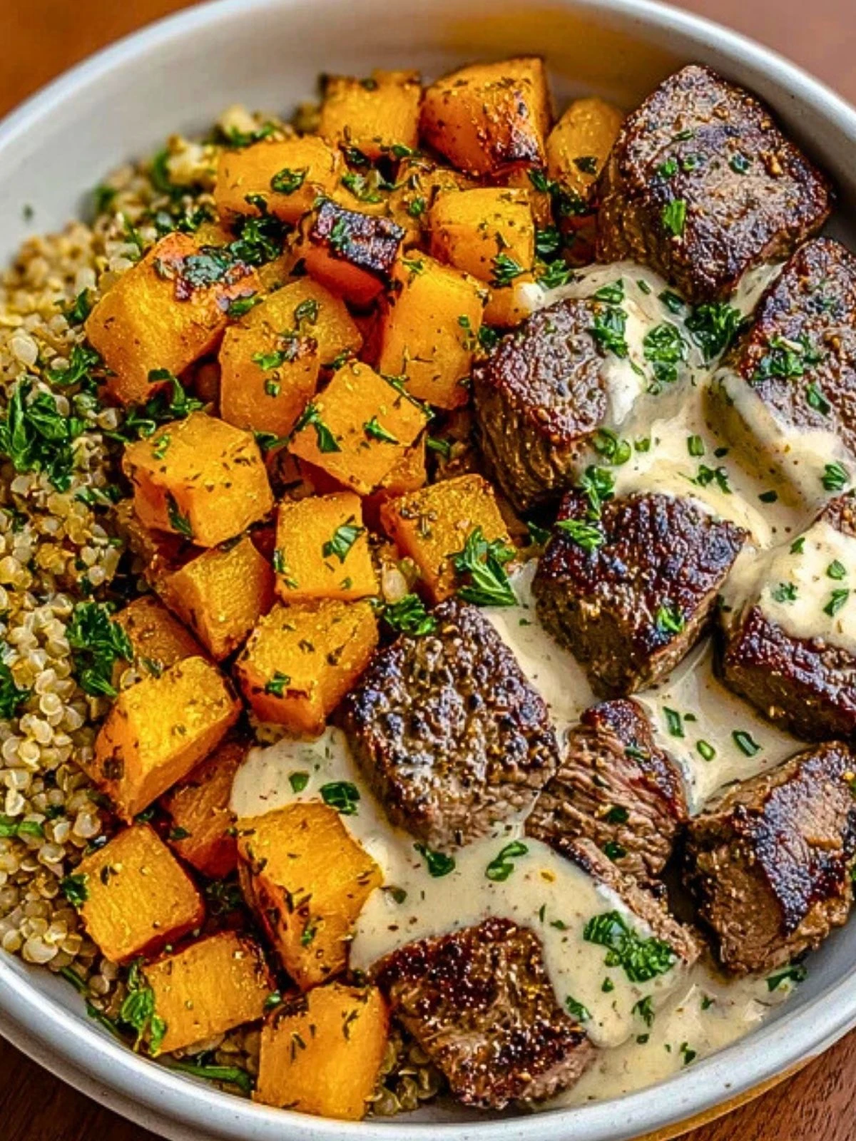 A hearty and wholesome bowl featuring seared garlic herb steak, roasted butternut squash, fluffy quinoa, and a rich garlic herb cream sauce. Perfect for cozy dinners or make-ahead lunches.