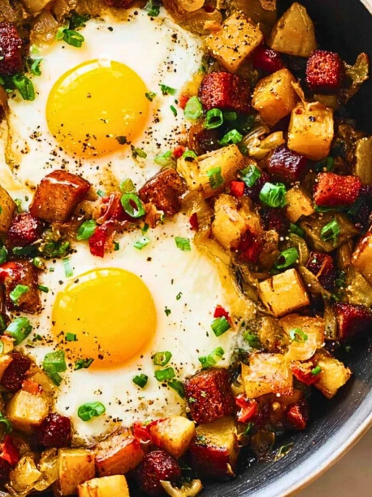What makes this hash especially satisfying is the play of textures and tastes. The potatoes are cubed to golden-brown perfection, the sausage adds a meaty depth, while the eggs bake into little pools of creaminess right in the center. It’s visually stunning and tastes even better than it looks. Whether you’re a fan of meal prepping or an impromptu skillet enthusiast, this dish is made to impress with minimal effort.