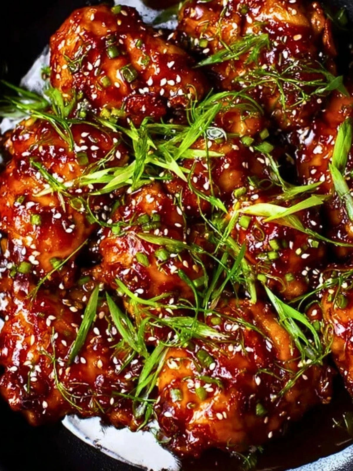 Return the chicken to the thickened sauce, coating well. Serve with steamed rice or roasted veggies. Garnish with sesame seeds and chopped green onions if desired.