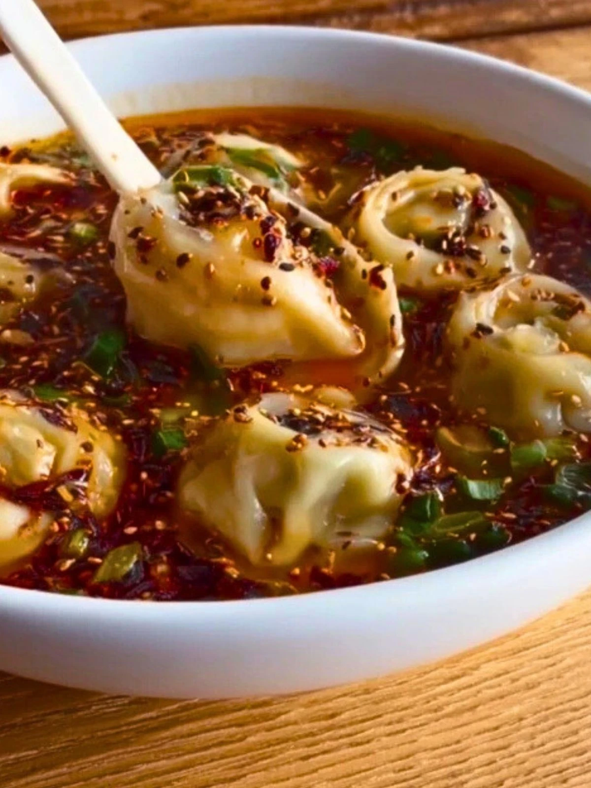 This soup is best served piping hot, right after the dumplings have been cooked. Use deep soup bowls to showcase the glistening chili oil and aromatic steam rising from the broth. A sprinkle of fresh herbs and a drizzle of extra chili oil make for an eye-catching finish.
