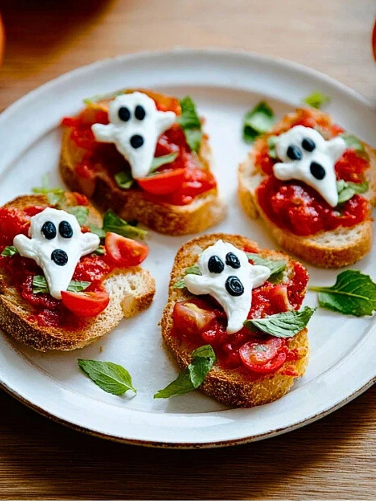 Spoon the tomato bruschetta mix onto each toasted bread slice. Carefully transfer a mozzarella ghost onto each one. Garnish with extra basil for color if desired.