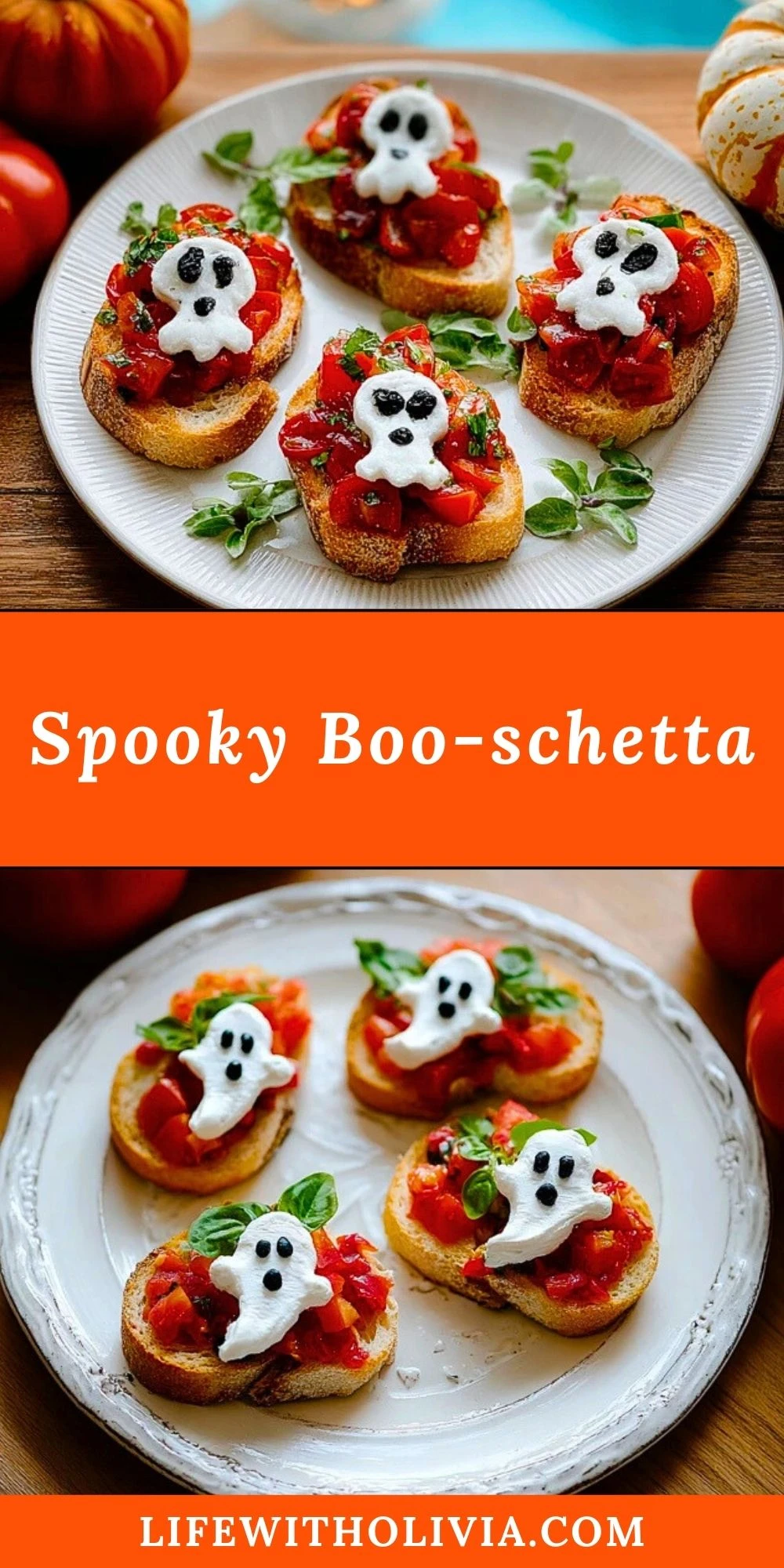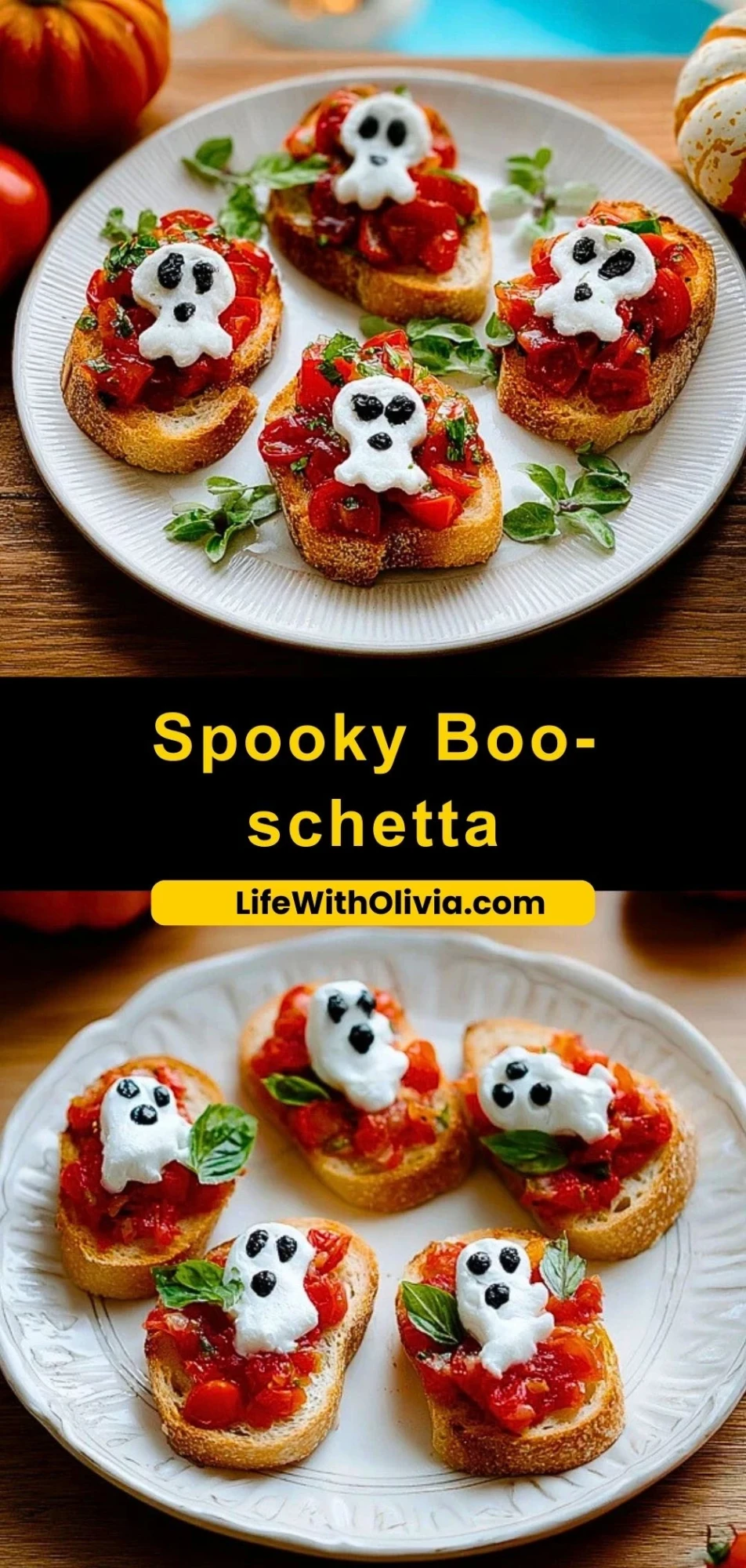 Serve your Spooky Boo-schetta as a festive starter at your next Halloween party or themed dinner. They look adorable arranged on a large platter with extra basil or spooky garnishes around the edges.