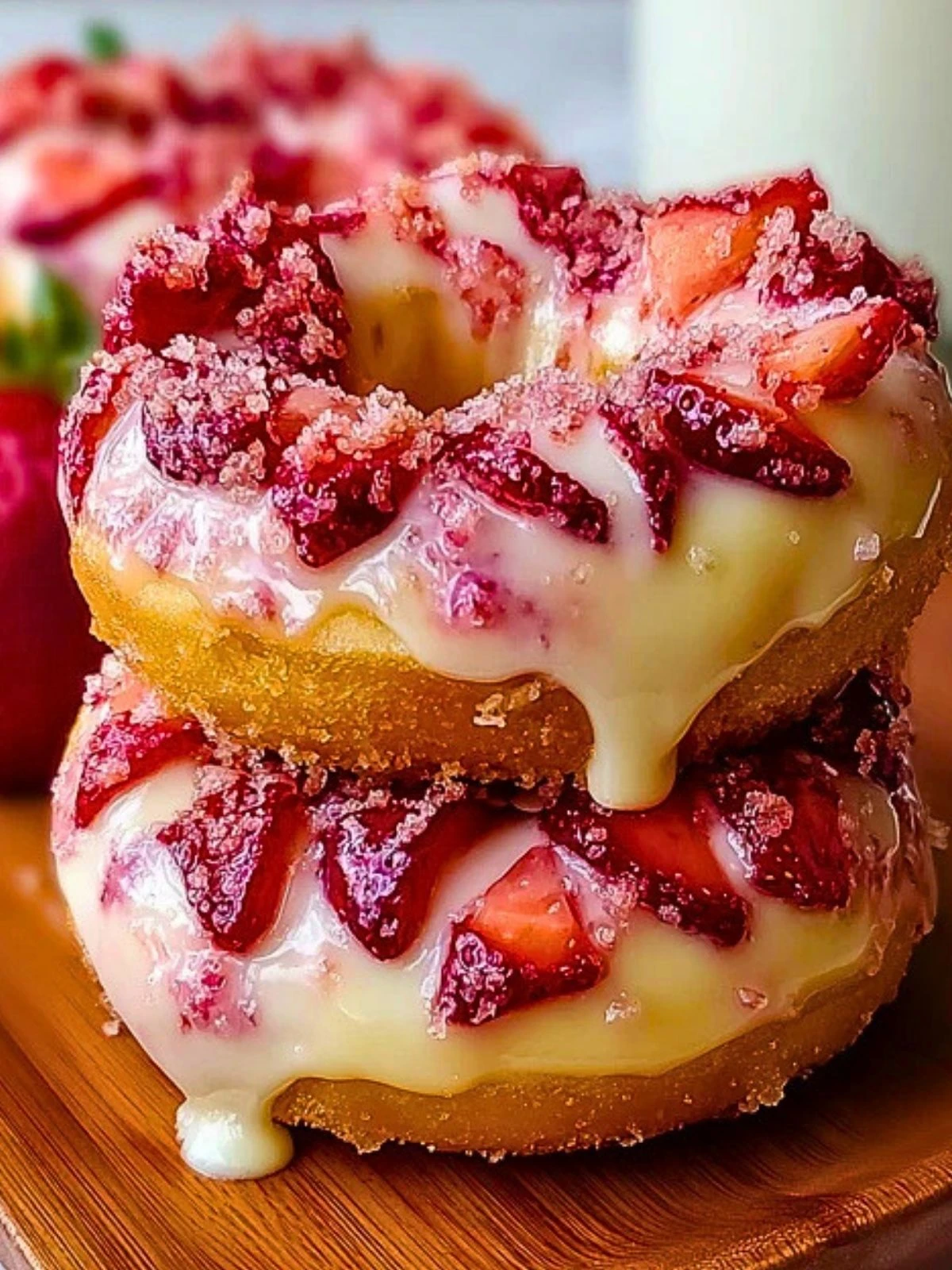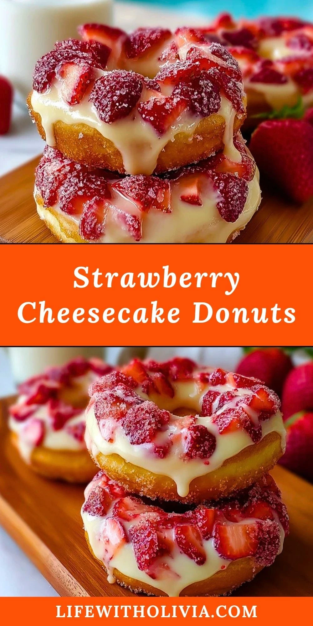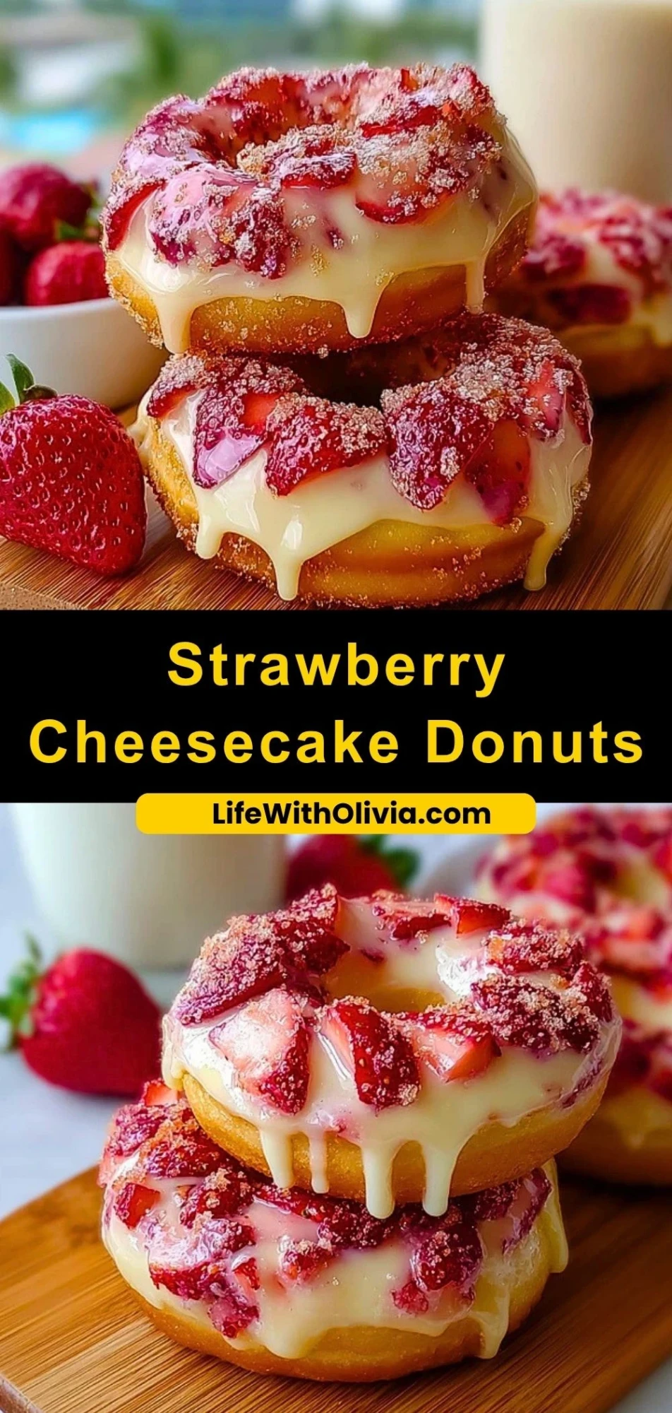 Imagine biting into a fluffy, golden donut topped with a luscious cream cheese glaze and sweet, juicy strawberries. Now add a dusting of sugar crystals for that irresistible crunch. These Strawberry Cheesecake Donuts are not just donuts—they’re a full-on dessert experience you can hold in your hand. Perfect for brunches, birthdays, or simply a sweet indulgence, these beauties are the lovechild of a classic donut and your favorite cheesecake.