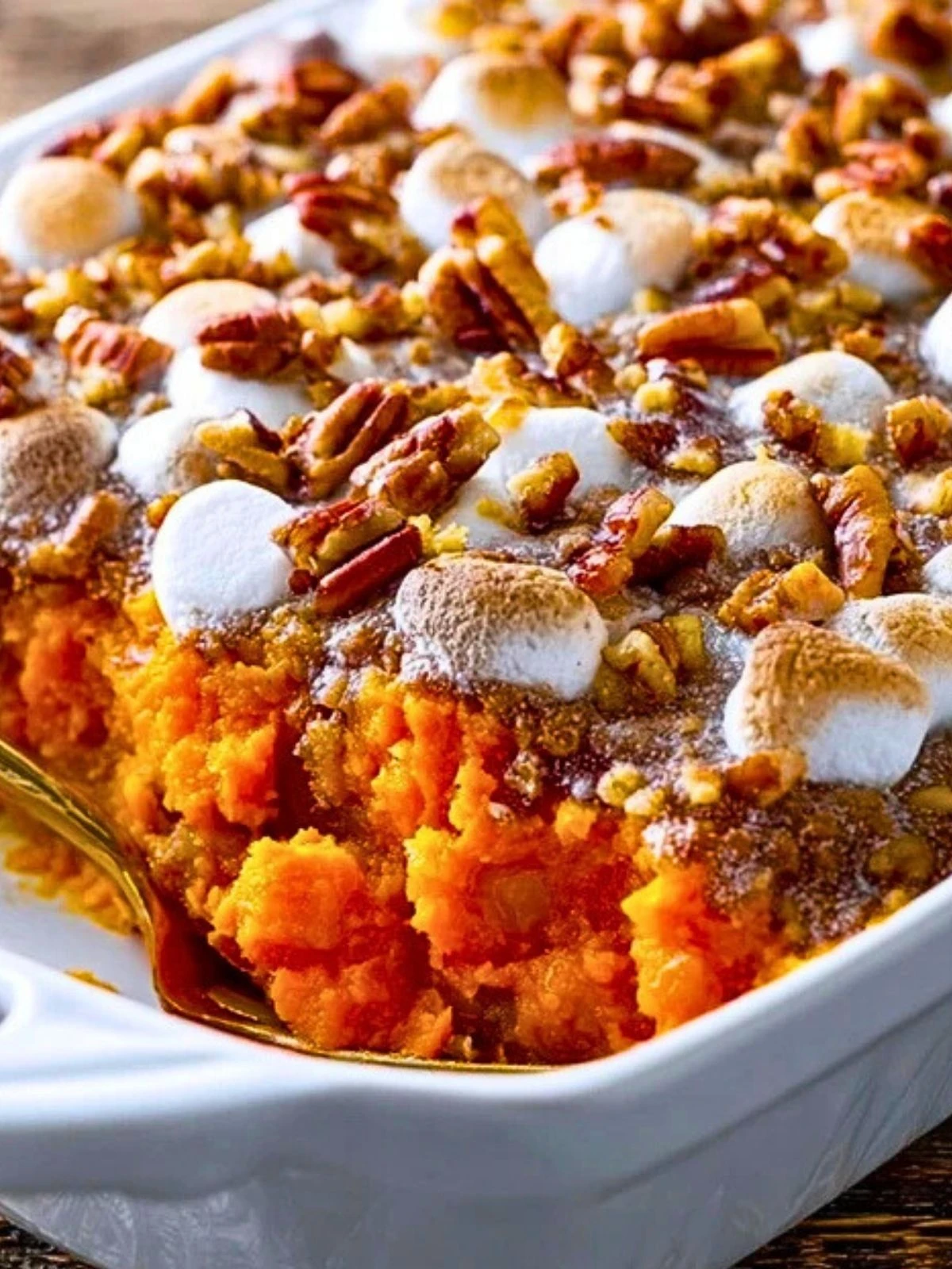 Serve this dish warm, straight from the oven. It’s best enjoyed fresh when the marshmallows are melty and the pecans are perfectly crisp. Pair it with roasted turkey, ham, or even just a simple green salad for balance.