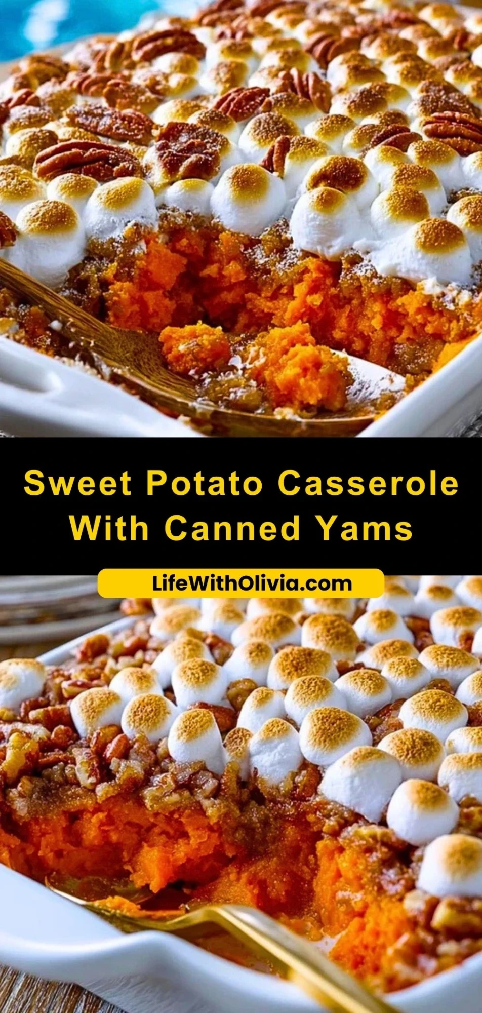 This Sweet Potato Casserole With Canned Yams is the ultimate comfort side dish with creamy, spiced mashed yams topped with a brown sugar-pecan crumble and golden toasted marshmallows. Perfect for holidays or cozy dinners.