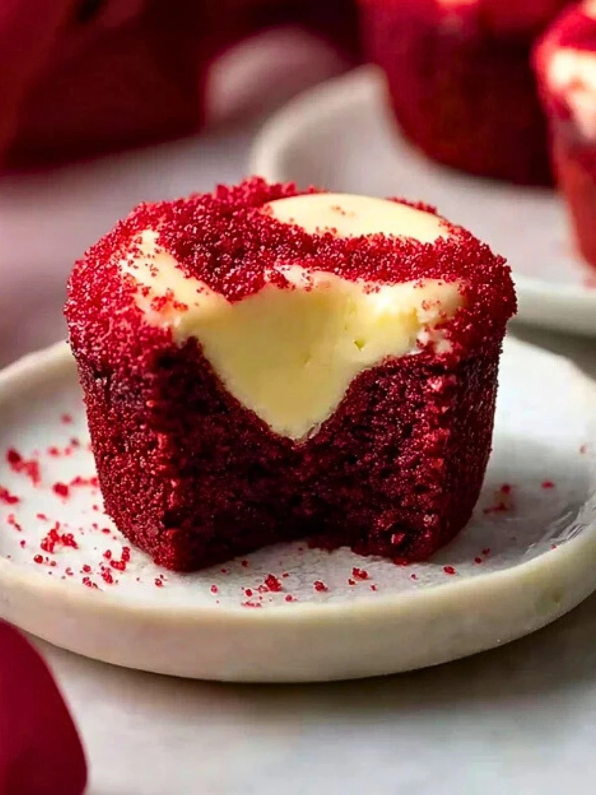 Spoon about a tablespoon of red velvet batter into each muffin cup. Add a teaspoon of cream cheese filling to the center. Top with another small scoop of batter, just enough to partially cover the filling. Optionally, swirl the top slightly with a toothpick for a marbled effect.