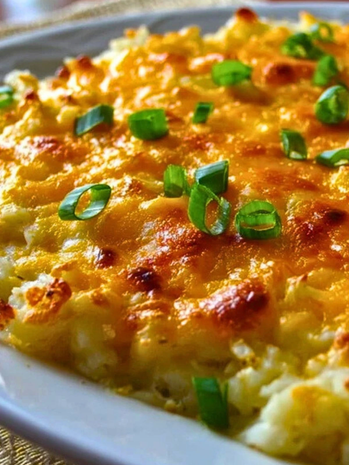 This creamy and comforting side dish features frozen hash browns baked in a rich, cheesy blend of sour cream, cream of chicken soup, and butter. It’s finished with a golden crust and optional green onion topping—perfect for Thanksgiving or any cozy meal.