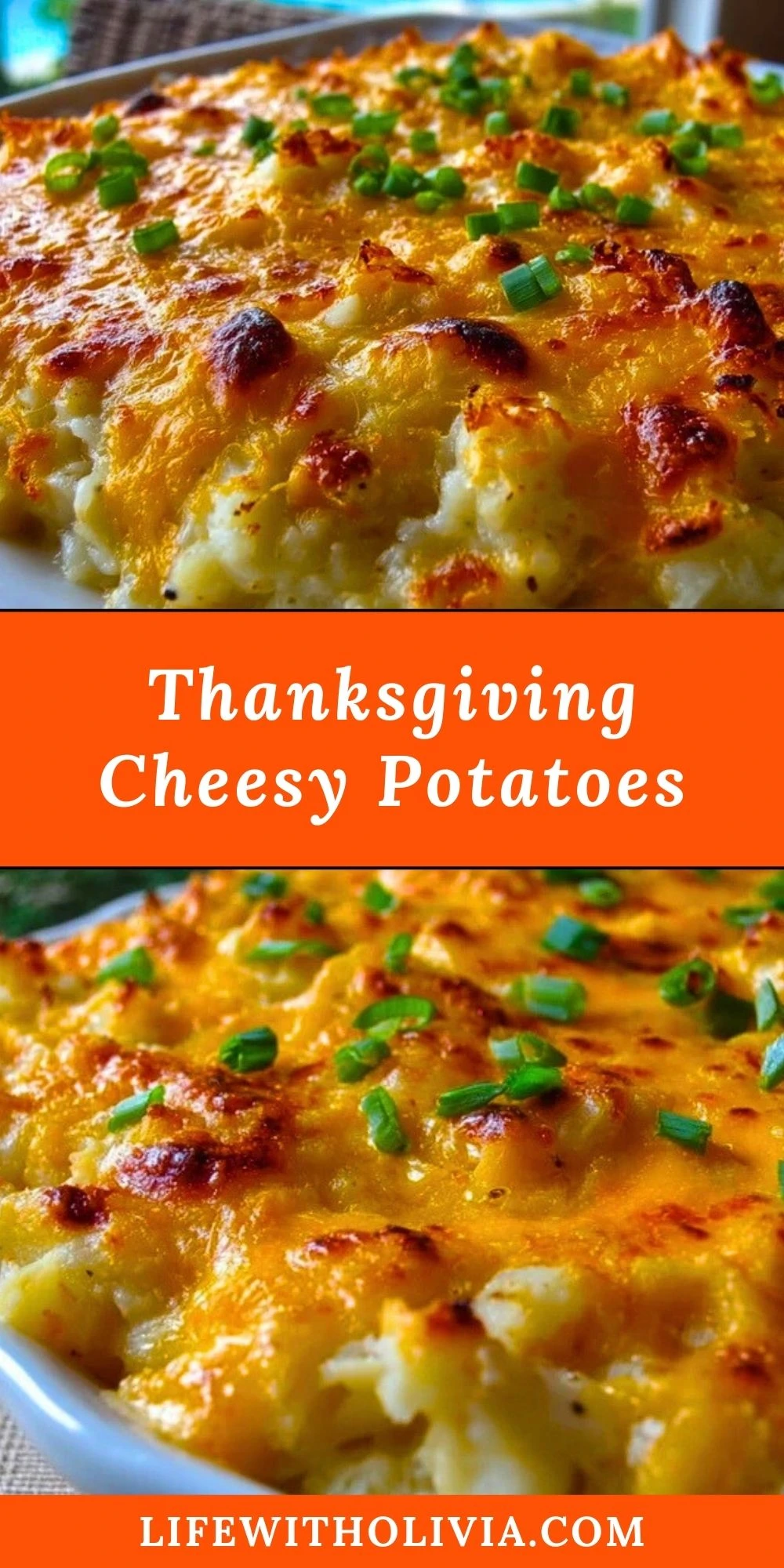 Golden, bubbling, and irresistibly creamy, Thanksgiving Cheesy Potatoes are the ultimate side dish that guarantees to steal the show at any holiday table. This casserole-style classic is a warm hug in a dish—velvety potatoes smothered in a blend of melted cheeses, baked until golden perfection, and finished with a sprinkle of green onions for that pop of color and bite.