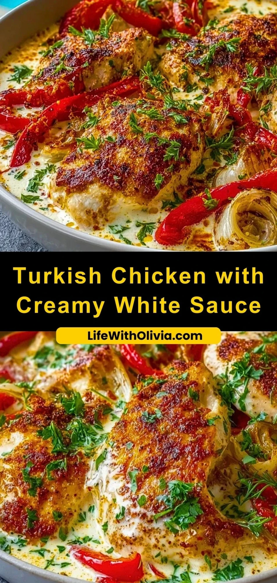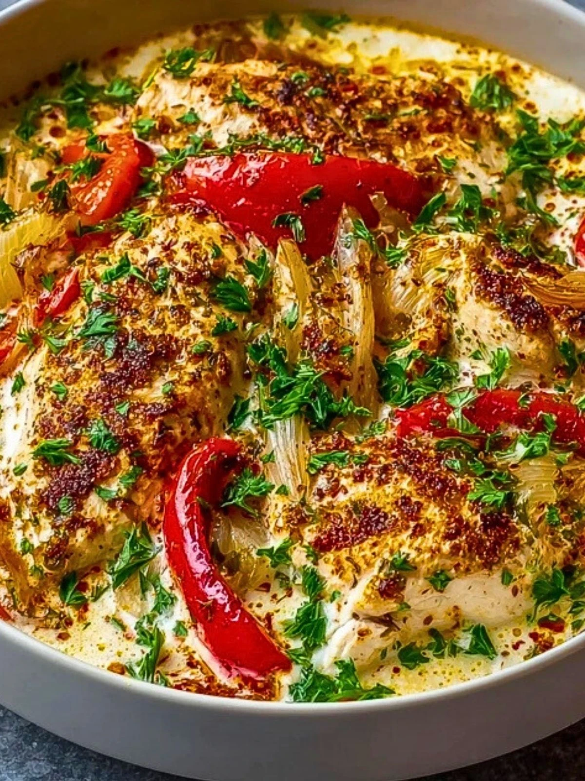 This Turkish Chicken with Creamy White Sauce is pure comfort in a bowl. Tender, juicy chicken breasts are nestled in a luscious, herb-infused white sauce, with sweet roasted red peppers and caramelized onions adding depth and warmth to every bite. The bold mustard crust on the chicken contrasts beautifully with the mellow cream base, creating a dish that is as rich in flavor as it is in aroma.