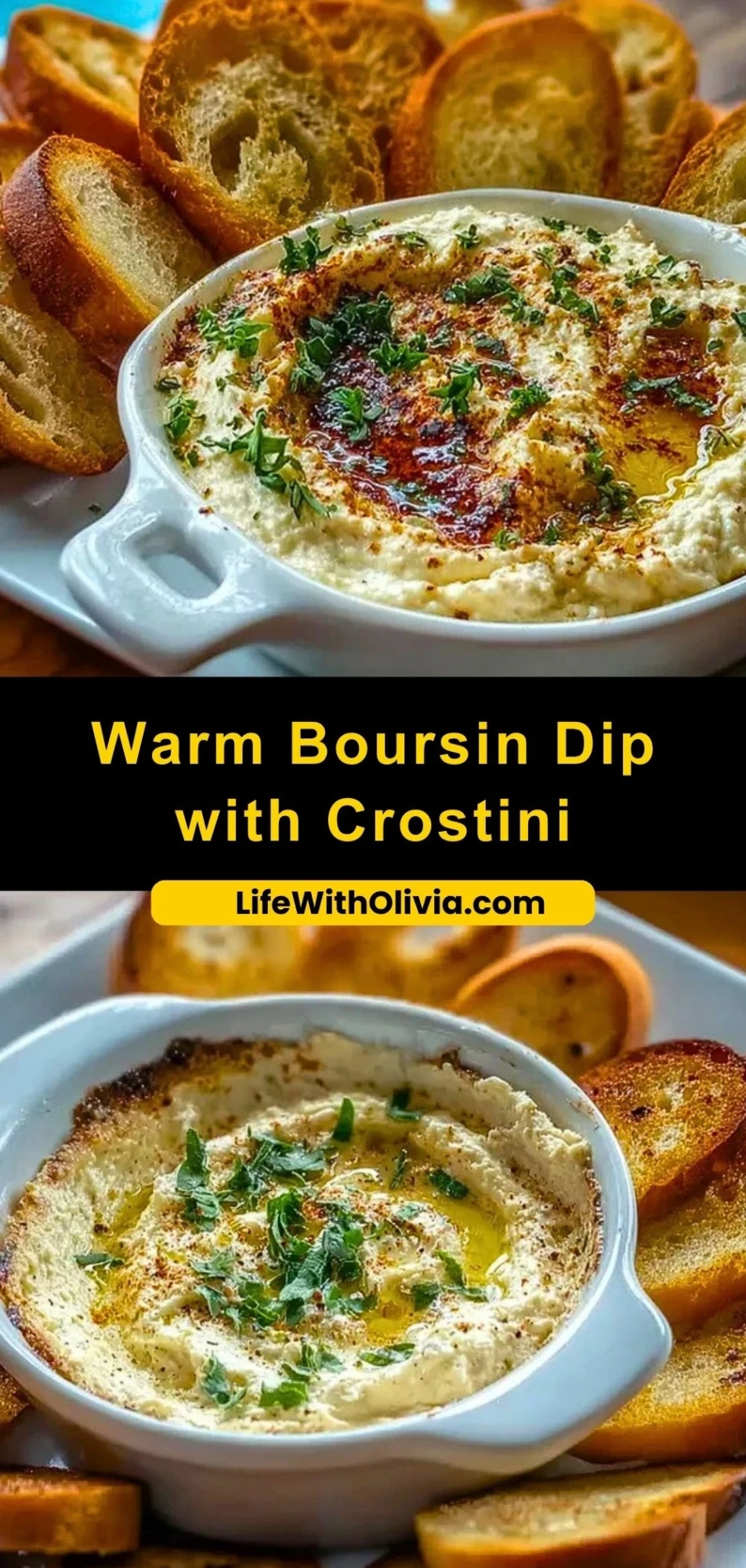 Warm Boursin Dip with Crostini is a creamy, crowd-pleasing appetizer perfect for parties and gatherings. Made with Boursin cheese, cream cheese, and a touch of mozzarella, it’s melty, rich, and irresistibly scoopable. Served with crisp crostini, it’s the kind of simple indulgence that guests always remember.